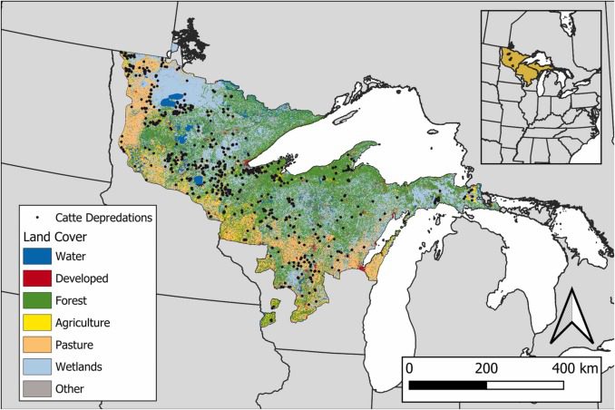 Resources » Conflicts » A spatial risk map of gray wolf livestock depredations across the Great Lakes Region